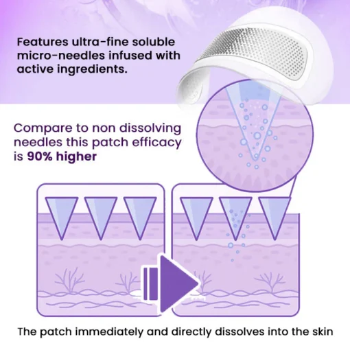 - Each patch features thousands of ultra-fine microneedles that painlessly dissolve into the skin, delivering active ingredients deep beneath the surface.