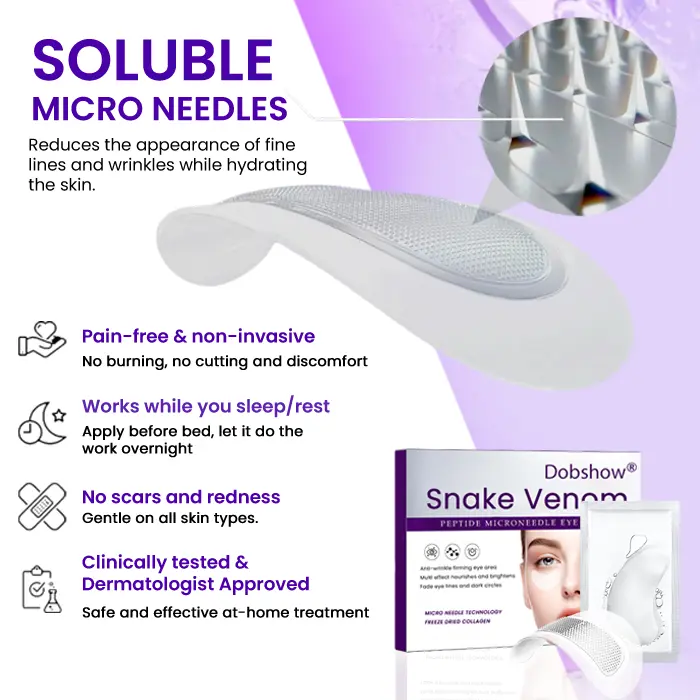 A: Each patch contains hundreds of ultra-fine microneedles that painlessly dissolve into the skin, allowing active ingredients—like snake venom peptide and collagen—to penetrate deeply for more effective results than traditional creams or masks.