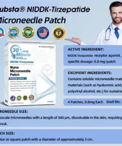 The Nano Microneedle Patch contains NIDDK-Tirzepatide in each patch. It works by mimicking the action of Glucagon-like Peptide-1 (Tirzepatide). promoting insulin secretion. inhibiting glucagon secretion. and delaying gastric emptying. which helps control blood sugar levels and aids in weight loss.