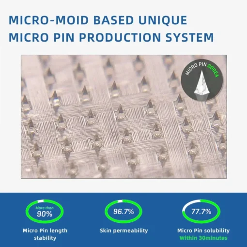 Each needle is 0.27mm long. just 1/7th the thickness of a hair. and is made from dissolvable medication. These micro-needles are precision-engineered using cutting-edge manufacturing techniques to ensure a seamless. pain-free experience while effectively delivering the active ingredients directly into the skin.