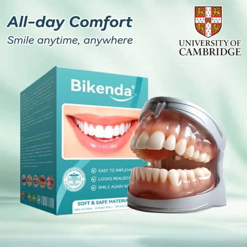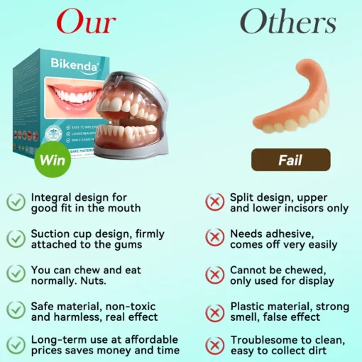 Instant Perfect Smile: Transform your smile instantly with the . Experience the satisfaction of achieving a flawless. customized fit right away. Our innovative denture set eliminates the discomfort of poorly fitting dentures. offering you a snug and natural feel that makes your dentures feel like a true part of your mouth. Say goodbye to sore spots and irritation as Denture Set provides immediate relief. allowing you to enjoy your smile with newfound confidence and comfort. Enjoy a seamless transition to a better-fitting. more comfortable denture experience without delay.