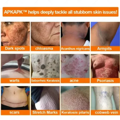 Fast Results:Β Noticeable improvement in skin condition in a short timeβfine lines, dark spots, and acne significantly reduce within three days, while issues like scars, psoriasis, and warts are effectively alleviated within seven days.