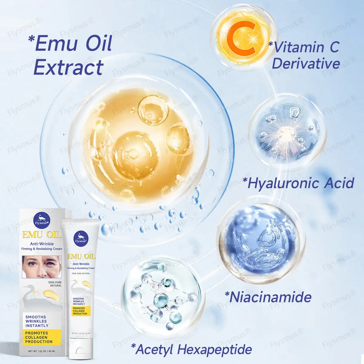 Flysmus® Emu Oil Anti-Wrinkle Firming & Revitalizing Cream works through a powerful triple-action formula that targets all layers of the skin—epidermis, dermis, and deeper tissues—to fight aging from the inside out. Emu oil and hyaluronic acid deeply hydrate and nourish dry, rough skin. Acetyl Hexapeptide-8 (Argireline) and niacinamide help boost collagen, smooth expression lines, and improve firmness. Vitamin C fights free radicals, brightens the skin, and helps prevent signs of aging. With deep-layer repair and multiple anti-aging benefits working together, this cream truly smooths wrinkles at the source and brings back a youthful, radiant glow.