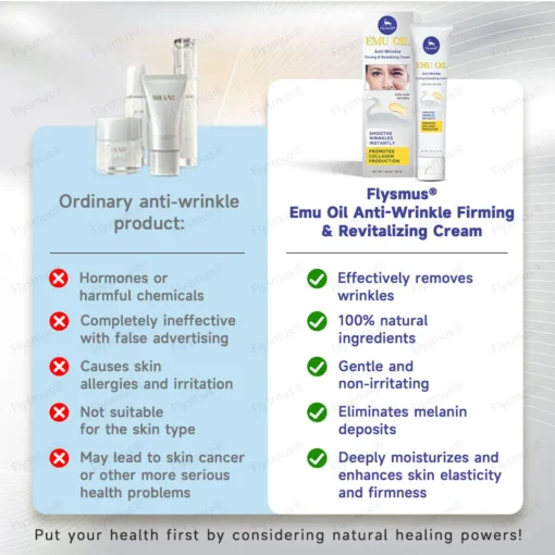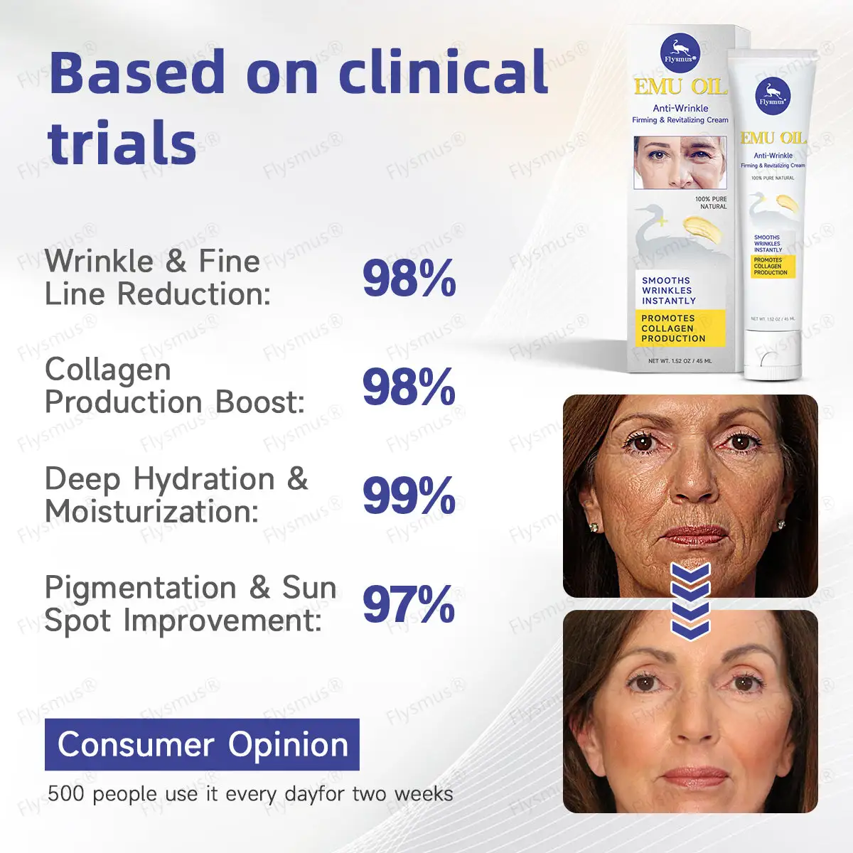Tired of the high costs and long wait times of Botox? Disappointed by skincare products that didn’t live up to your expectations? It’s time to regain your confidence with Flysmus® Emu Oil Anti-Wrinkle Firming Cream!