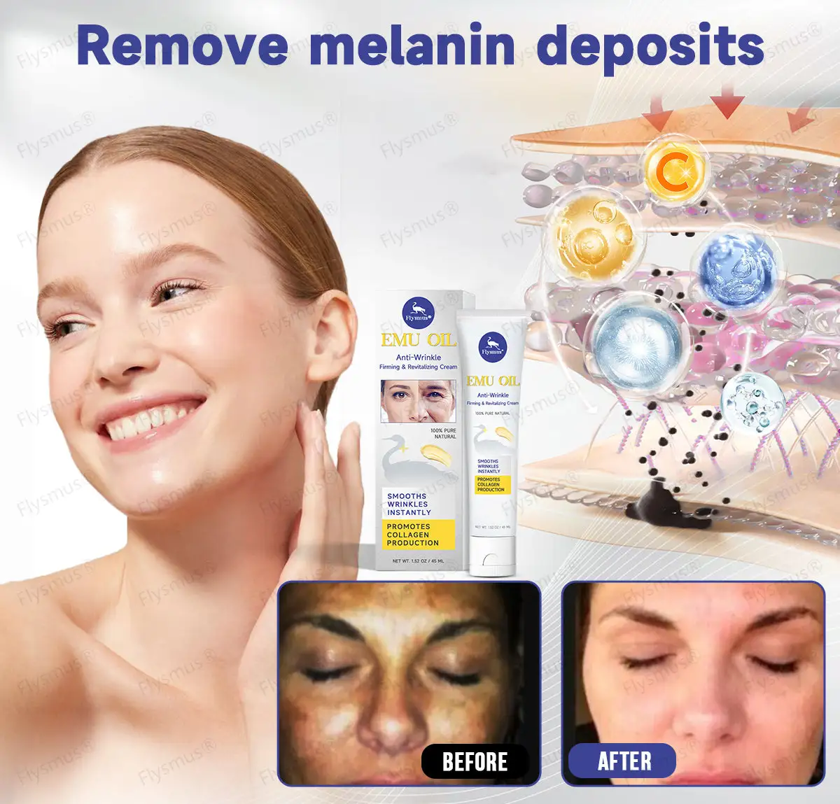 The niacinamide in flysmus® Emu Oil Anti-Wrinkle Firming Renewal Cream effectively inhibits melanin production, helping to reduce dark spots, sun spots, freckles, and other pigmentation issues, resulting in a more even and radiant skin tone. With long-term use, it can brighten the complexion and diminish dullness.