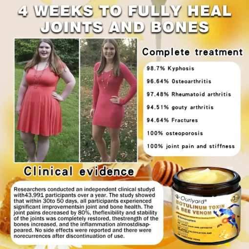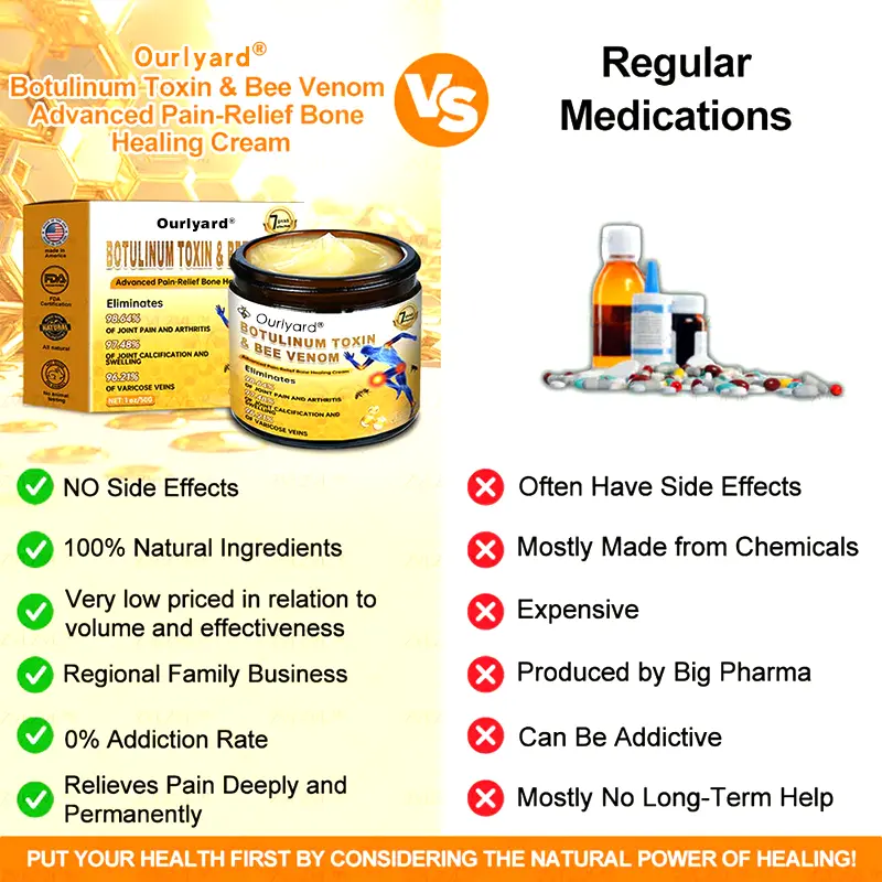 Choose Ourlyard® Botulinum Toxin & Bee Venom Pain-Relief Bone Healing Cream with absolute confidence. Backed by rigorous scientific research and trusted by orthopedic experts, this innovative formula combines the power of Botulinum Toxin and Bee Venom to deliver exceptional results. Whether you’re dealing with joint discomfort, stiffness, or arthritis symptoms, this cream is designed to provide fast, effective, and lasting relief.