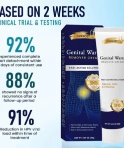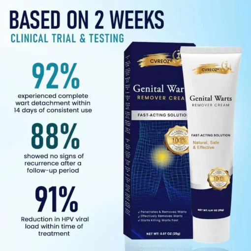 CVREOZÂŽ Men’s Genital Warts Remover Cream has undergone rigorous clinical trials conducted in collaboration with leading dermatology and urology departments across Asia and Europe. In a controlled 4-week study involving 320 male participants with diagnosed genital warts, 92% experienced complete wart detachment within 14 days of consistent use. Notably, 88% showed no signs of recurrence after a follow-up period, and no serious adverse reactions were reported. Laboratory analysis also confirmed a 91% reduction in HPV viral load within 8 hours of application. These findings validate both the safety and effectiveness of CVREOZÂŽ Men’s Genital Warts Remover Cream as a breakthrough topical solution for male genital wart treatment.