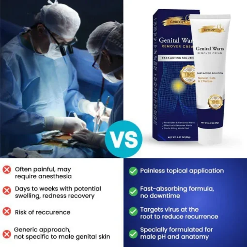 Conventional wart treatments – like cryotherapy, acid burning, and prescription ointments – often fall short because they only treat whatâs on the surface. These approaches are painful, risky, and prone to recurrence because they ignore the virus hiding beneath the skin. CVREOZÂŽ Men’s Genital Warts Remover Cream is different. Itâs painless, clinically tested, and designed for male anatomy. It doesn’t just remove visible warts – it targets the virus at its root for long-term results and skin that looks and feels healthy again.