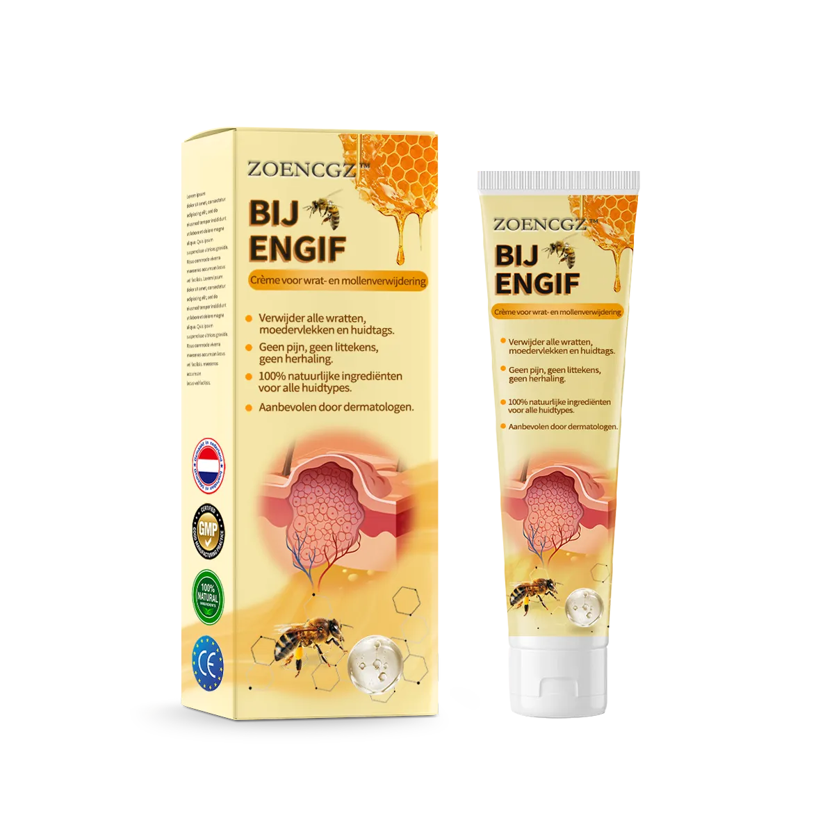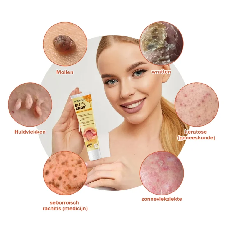 Zoencgz⒠Bijengif Mollenwrat Behandelingscrème is een oplossing die de krachtige effecten van bijengif benut om effectief verschillende huidimperfecties aan te pakken, waaronder huidtags, moedervlekken, wratten en vlekken. Deze geavanceerde formule bevat actieve verbindingen die uit bijengif zijn geëxtraheerd, welke ongewenste gezwellen afbreken en zachtjes verwijderen.