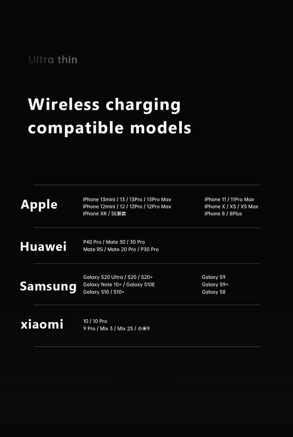 support most of devices which built-in wireless charging function.(PS : Turn on the switch button before the device is wirelessly charged)