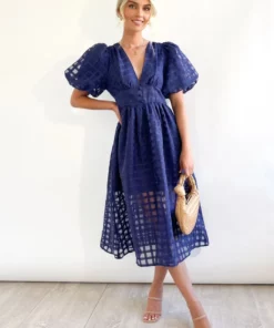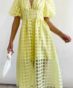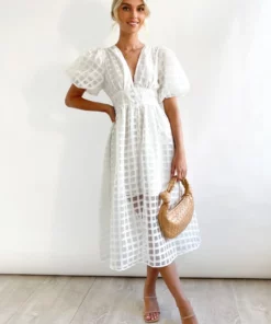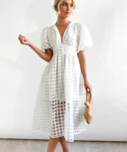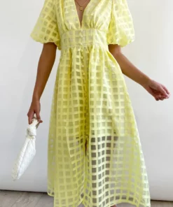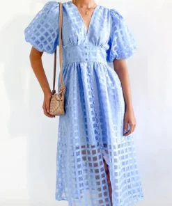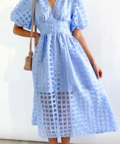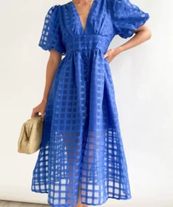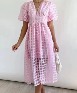 Features:  V-neck, hollow grid, elegance, A-line skirt, pleats, puff sleeves, slim, knee-high, stretch cuffs.