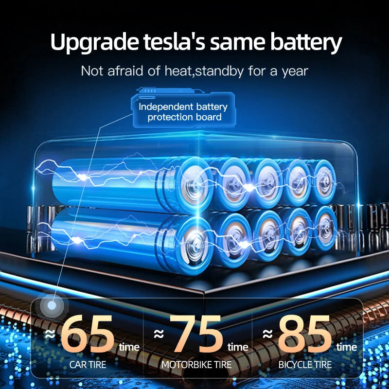 - Fast Inflation, 1min Fast Filling-After thousands of polishing and upgrading, we got a breakthrough! Reference turbo design, this small portable tire inflator is embedded with a powerful Double pump air multiplication technology. It provides a maximum pressure of 1.5 PSI. It is a good helper for your driving! (Mark: Testing database on a flat standard tire 185/65/R15).