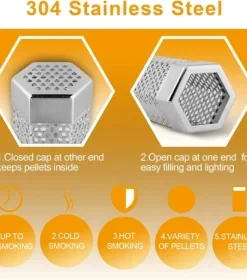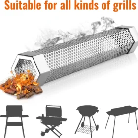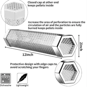 - ❤️【IMPROVED DESIGN AND 304 STAINLESS STEEL MATERIAL】 Our premium stainless steel tube smoker with new hexagon design, it will not roll up or fall off on the grill to provide you a better smoke absorption effect. What’s more, this 12″ smoker tube is made of 100% high quality 304 stainless steel material, not be broken or bent easily after repeated use. Keep you and your family in healthy.
