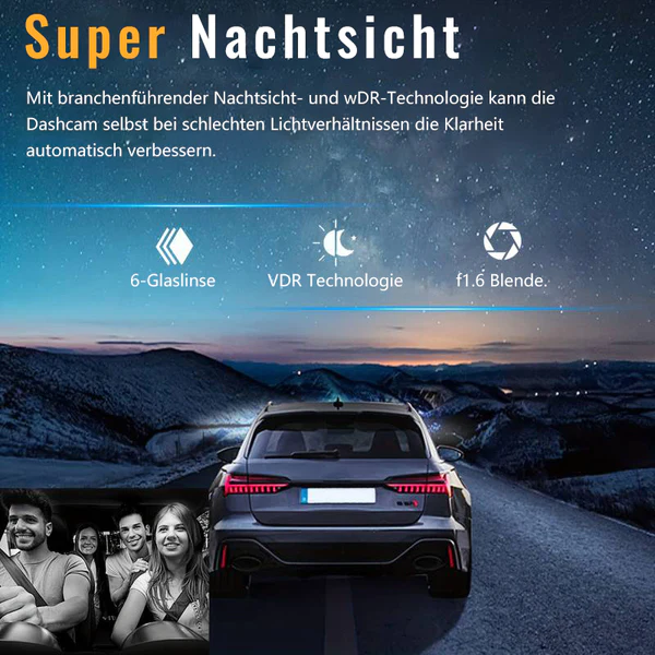 Die Dash Cam erfasst mit ihren Weitwinkelobjektiven mehr von der Umgebung und gewährleistet somit, dass Sie weniger tote Winkel haben und eine vollständige Abdeckung um Ihr Fahrzeug herum haben.