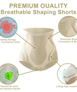 The PEARLMOON™ IONIC Tourmaline Fabric Breathable Shaping Shorts utilize massaging properties and ion release to stimulate collagen production. This process helps tighten and lift sagging or misshapen buttocks, resulting in the disappearance of loose skin and excess fat.