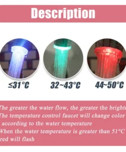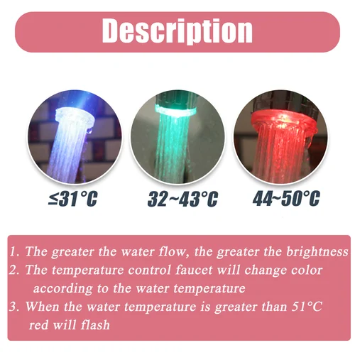 When the water temperature is below 31℃, the light color is blue. When the water temperature is between 32℃ to 43℃, the right shows green. When the water temperature is between 44℃ to 99℃, it turns to red.When the water temperature is higher than 51℃, the light flashing red.