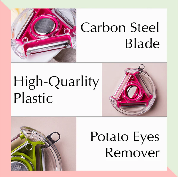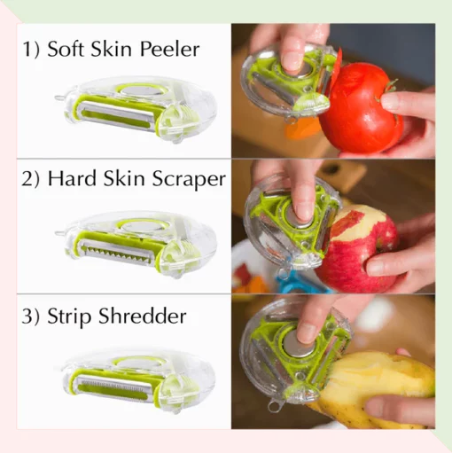Our 3-In-1 Rotary Peeler perfectly combines three common scrapers in one tool to peel off all soft & hard skin veggie and shred strips!