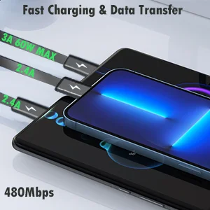 The output current: type C is 3A and IOS/micro is 2.4A. the charging cable is equipped with charge devices such as mobile phones, tablets, and laptops.