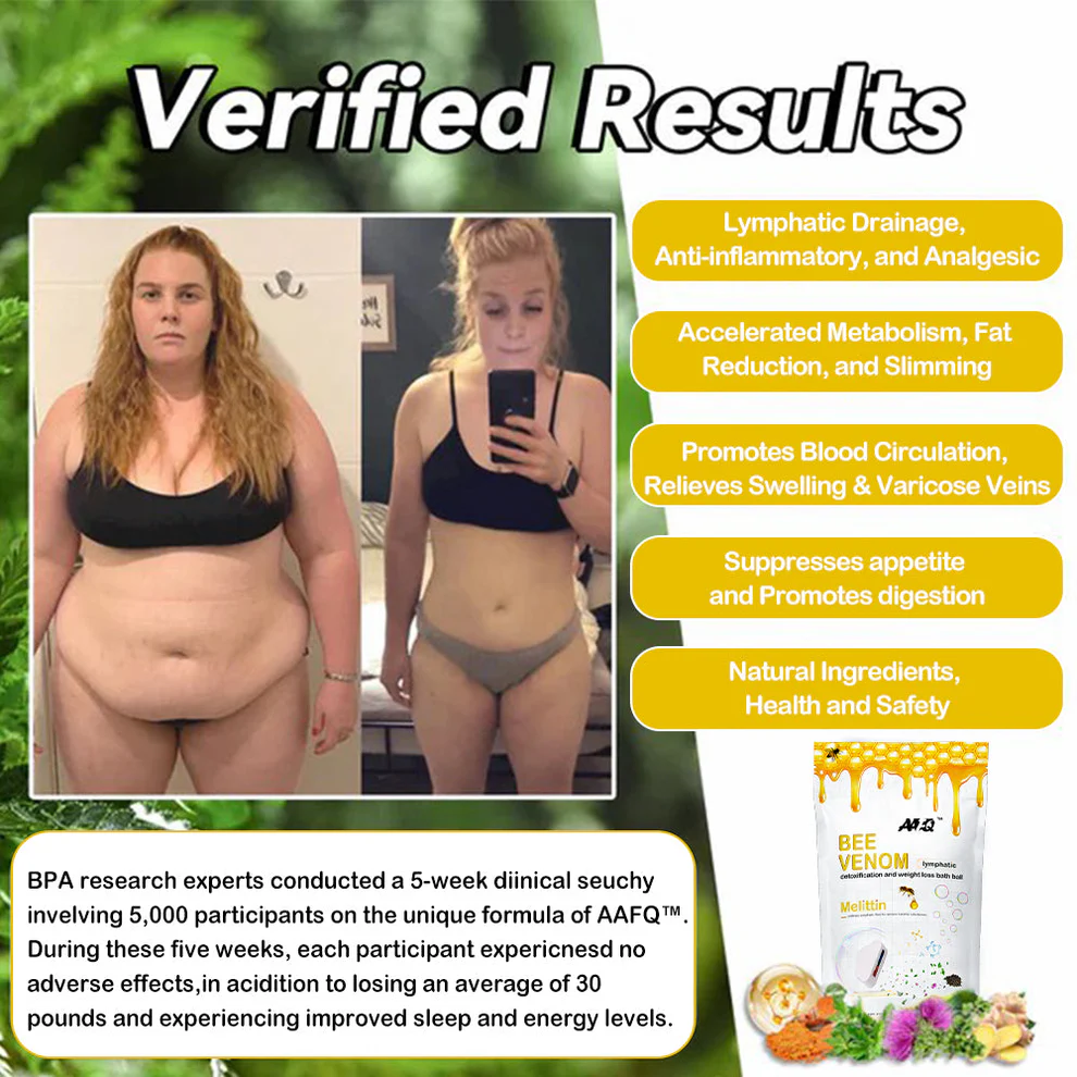 The digestive system and lymphatic system are important detoxification pathways in the body. That’s why we developed the AAFQ™ Bee Venom Lymphatic Drainage Weight Loss Bath Ball, which contains bee venom, absinthe and ice botanical extracts, as well as extracts of four natural herbs. Highly active ingredients are concentrated and encapsulated in bath balls. To use, soak the bath ball in warm water for 4 to 5 minutes until the bath ball melts. Herbal essence can be absorbed through bathing. It can stimulate multiple reflection points in the body, effectively promote blood circulation and lymphatic drainage, reduce the accumulation of fluid and cellulite in the body, enhance metabolism, easily lose weight and reduce inflammation, and promote a healthier body.