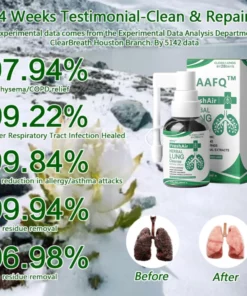 The AAFQ™ Organic Herbal Lung Repair Nasal Spray offers a simpler method to facilitate the removal of mucus and waste from the lungs, purify the lungs and upper respiratory passages, and fully restore any harm caused by allergies, asthma, dust, and smoking within an 8-week period. It provides an opportunity for individuals with weakened respiratory systems to regain the ability to breathe effortlessly.
