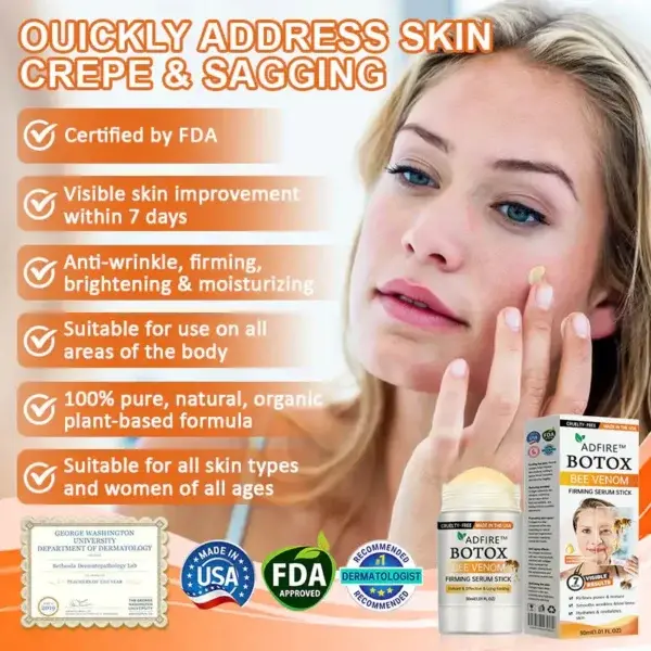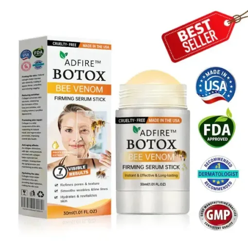 Endorsed by Dr. Sophia L Williams. a board-certified dermatologist with over 10 years of expertise in skincare. ADFIRE™ Botox Bee Venom Firming Serum Stick comes highly recommended. This exceptional product provides an ideal remedy for an array of skin issues. including neck lines. sagging arms. drooping breasts. chest discomfort. stretch marks. cellulite on the abdomen. thighs. and buttocks. as well as sagging buttocks. among others. Importantly. it achieves these results without any adverse side effects. Crafted entirely from 100% natural plant extracts. this cream is suitable for all skin types. including sensitive skin.