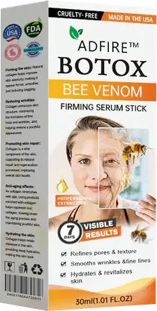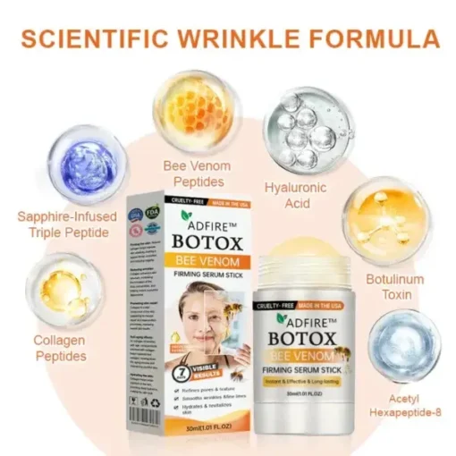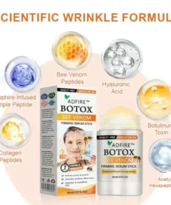 The ADFIRE™ Botox Bee Venom Firming Serum Stick is an effective solution for diminishing visible signs of aging and wrinkles. resulting in a rejuvenated skin appearance within a span of 3-5 weeks. This cream incorporates scientifically proven ingredients like Sapphire-Infused Triple Peptide. Tri-Hyaluronic Acid and Micro Algae which effectively combat wrinkles and promote skin vitality.