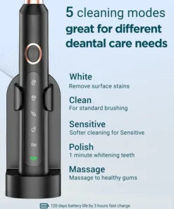 5 Brushing Modes & 3 Intensity Levels: White mode: Whitens teeth; Clean mode: Daily cleaning; Sensitive mode: Lower intensity cleaning for sensitive gums or teeth or for first-time users; Polish mode: Smooths & brightens teeth; Massage mode: Massages & improves gum health. Each mode comes with 3 intensity levels so you can personalize your routine for your needs.