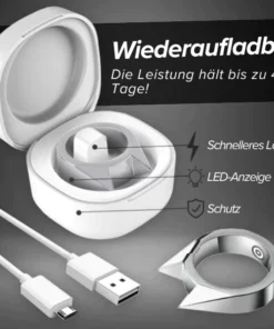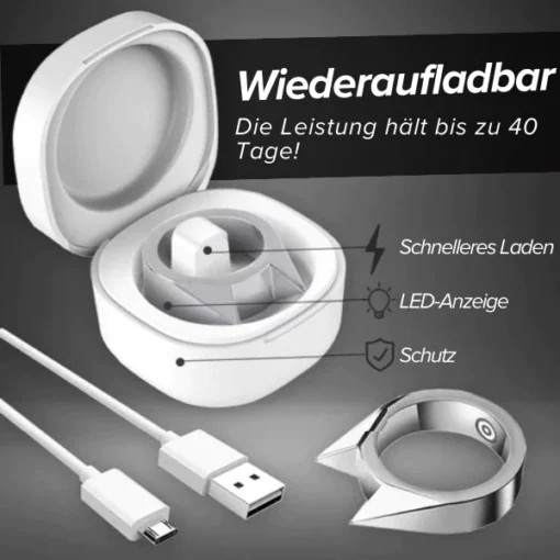 Wiederaufladbar und wasserdicht: Mit einem integrierten Stecker für bequemes Aufladen und einem wiederaufladbaren Akku bleibt der AEXZR™ Verteidigungsring 30-45 Tage betriebsbereit. Seine wasserdichte und strapazierfähige Konstruktion hält Spritzern und Schmutz stand und macht ihn zu einem Muss für diejenigen, die Sicherheit priorisieren, ohne dabei auf Stil zu verzichten.