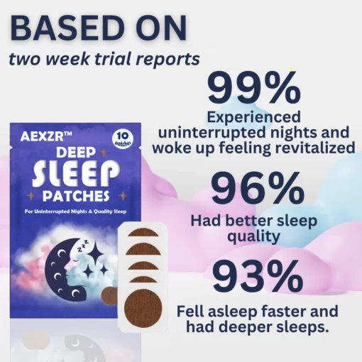 Incorporating AEXZR™ Deep Sleep Patches into your nightly routine can make all the difference in your sleep quality. It works diligently to alleviate the burdens of fatigue and anxiety, allowing you to relax and prepare your body and mind for a peaceful night’s sleep. Thanks to its unique formula and carefully selected ingredients, it facilitates a quick transition into a restful slumber, ensuring you don’t spend hours tossing and turning before finally drifting off.