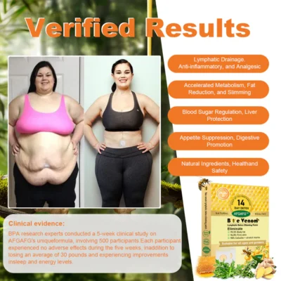 The digestive and lymphatic systems are vital pathways for detoxification in the body. That’s why we developed AFGAFG™ Bee Lymphatic Drainage Slimming Patches, which contain bee venom, plantain extract, as well as extracts from four natural herbs. Highly active ingredients are concentrated and enclosed in the silky wrap of the slimming patch. During application, close contact between the abdomen and the silky wrap of natural herbs stimulates intestinal peristalsis, facilitating faster and more effective penetration into the lymphatic system. By cleansing the lymph nodes to remove waste and supporting liver detoxification and toxin absorption, it improves metabolism, leading to effortless fat loss and reduction of inflammation, promoting a healthier body.