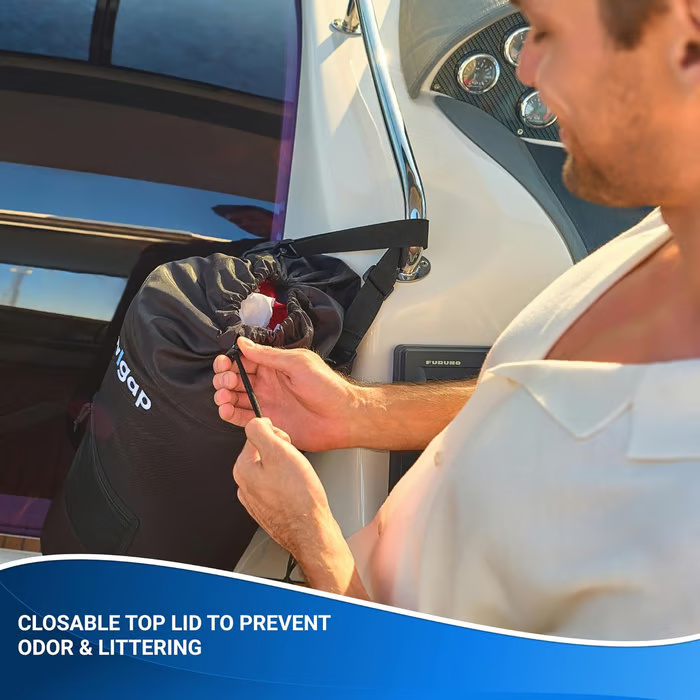 The Avigap Boat Trash Can can be used without a trash bag thanks to its leak-resistant inner lining. For longer trips, simply attach a standard 10-13 gallon trash bag using the 6 sturdy aluminum snaps inside—making waste disposal hassle-free and clean.
