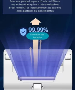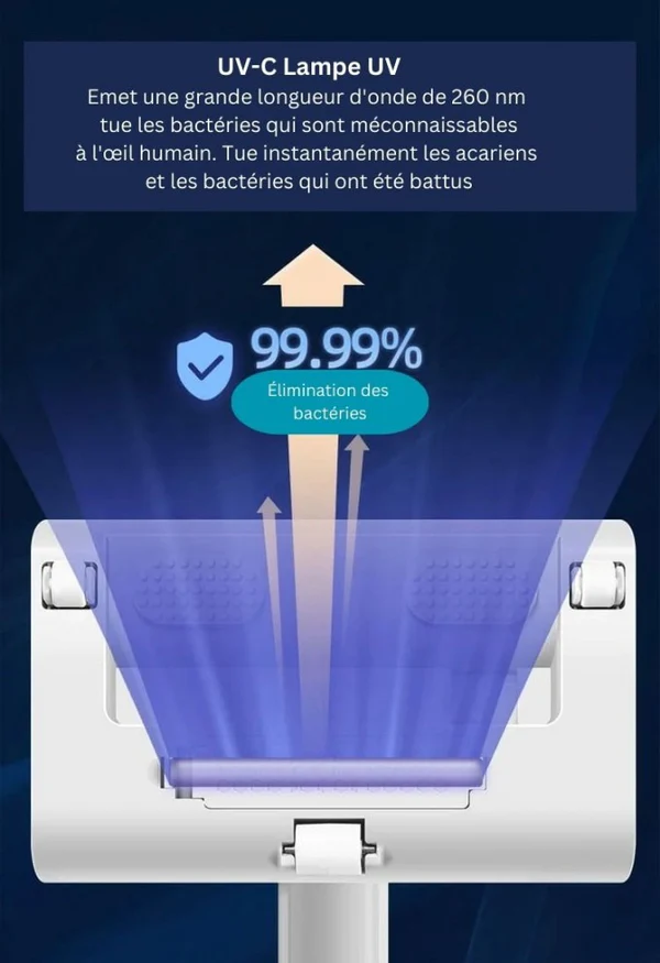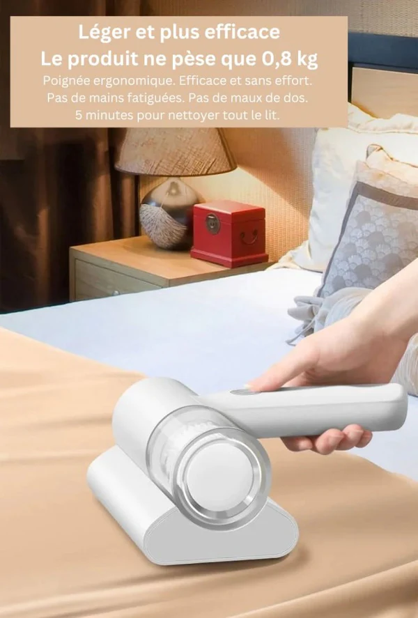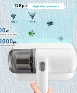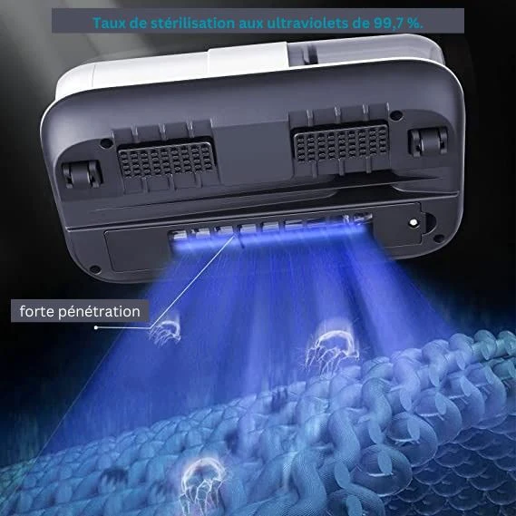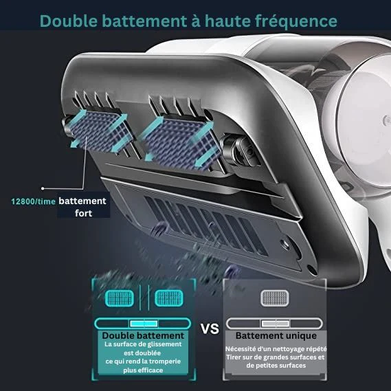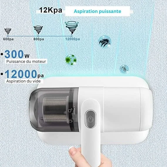 L’aspirateur de matelas est équipé d’une fonction de double impulsion, d’une fonction de vibration à haute fréquence combinée à une puissance d’aspiration de 12 kpa qui permet de nettoyer la poussière et la saleté en profondeur dans le matelas.
