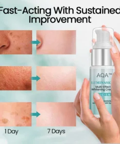 Your worries can end now! Our AQA™ LuminaSkin Multi-Effect Whitening Cream is specifically designed to conquer these skin challenges. Combining advanced whitening technology with deep nourishing ingredients, this product effectively lightens dark spots, evens out skin tone, and significantly reduces fine lines. Its unique triple-action formula not only helps swiftly restore brightness and radiance to your skin but also provides long-lasting hydration, strengthens the skin barrier, and protects against external environmental damage. With daily use, rejuvenate your skin’s youthful vitality and restore its natural glow.