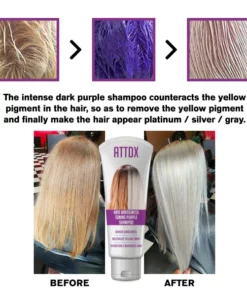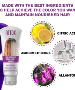 - Antioxidant Ingredients: This ATTDX AntiBrassiness Toning PurpleShampoo is enriched with extra violet pigments to maintain cool & even tones of blonde hair. Infused with antioxidant Citric acid, this nourishing formula ensures healthy-looking hair while effectively purifying and toning bleached blonde locks.