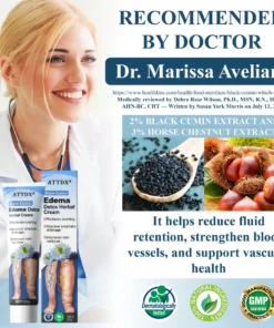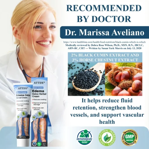 Endorsed by Dr. Marissa Aveliano, a specialist at the American Vein & Lymphatic Society, ATTDX® Black Cumin Edema Detox Herbal Cream has earned recognition for its ability to reduce swelling, improve circulation, and relieve discomfort.