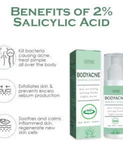 With a deep-cleansing formula that kills bacteria and gently exfoliates, the ATTDX BodyAcne Removal Cleanser Spray gets to the root cause of bacne as it keeps skin balanced and nourished. Its anti-acne formula cleanses deeply and gently exfoliates, unclogs pores, regulates oil secretion, and leaves your skin feeling fresh. This is the perfect way for you to take control of your acne, whether you’re dealing with whiteheads, blackheads, pustules, or cysts. This cleanser is infused with salicylic acid, witch hazel extract, and Mangosteen Extract to fight the bacteria that cause acne and help reduce the size of your pores. It also contains Aloe Vera Extract to nourish your skin, leaving you feeling fresh and clean.