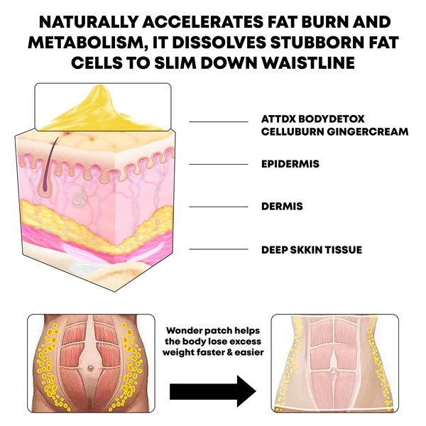 ATTDX BodyDetox CelluBurn GingerCream is a formula that helps reduce the layer of fat covering your abs, by shrinking and shaping your middle. The natural ingredients in ATTDX BodyDetox CelluBurn GingerCream penetrate deep into the fat cells and promote the breakdown of fat and the release of fatty acids. These fatty acids are then used by the body as energy, helping to reduce that stubborn layer of fat over your ab muscles.