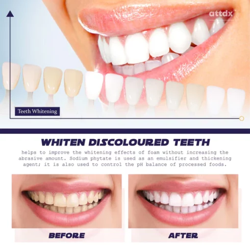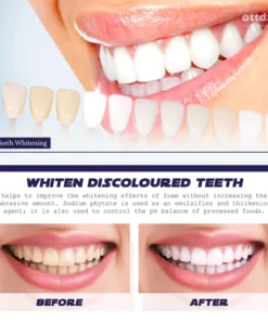 The specialized whitening formula gently erases surface pigmentation from teeth, rejuvenating their natural luminosity and promoting a brighter smile.