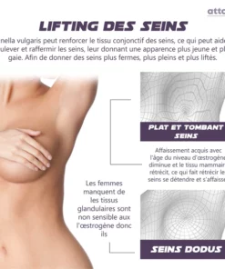Grâce à leur action synergique, ces ingrédients canalisent efficacement les nutriments essentiels directement vers le tissu mammaire, avec un taux d’absorption extraordinaire de 99 %. Ce taux d’absorption exceptionnel garantit que les nutriments sont pleinement utilisés, optimisant ainsi leur capacité à améliorer à la fois la taille et l’apparence des seins.
