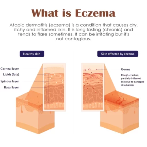 Atopic dermatitis (eczema) is a condition that causes dry, itchy, and inflamed skin. It’s common in young children but can occur at any age. Atopic dermatitis is long-lasting (chronic) and tends to flare sometimes. It can be irritating but it’s not contagious. Environmental factors or allergens – such as cold and dry weather, dampness, and more specific things such as house dust mites, pet fur, pollen, and molds. food allergies – such as allergies to cows’ milk, eggs, peanuts, soya, or wheat. certain materials are worn next to the skin – such as wool and synthetic fabrics.