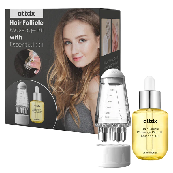 ATTDX HairFollicle Massage Kit with Essential Oil harnesses the power of our proprietary oil blend, synergizing with its scalp massager to optimize effectiveness. Experience the transformative benefits as our unique formula deeply nourishes your scalp, promoting robust hair growth and revitalized strands. Elevate your haircare regimen with ATTDX, unlocking the full potential of our potent oil blend.