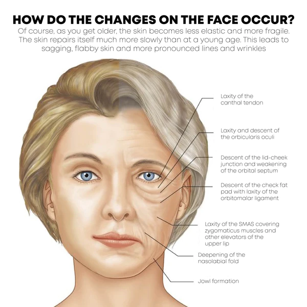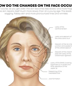 With age, that fat loses volume, clumps up, and shifts downward, so features that were formerly round may sink, and skin that was smooth and tight gets loose and sags. Meanwhile other parts of the face gain fat, particularly the lower half, so we tend to get baggy around the chin and jowly in the neck. Loss of muscle tone and thinning skin give the face a flabby or drooping appearance. In some people, sagging jowls may create the look of a double chin. Your skin also dries out and the underlying layer of fat shrinks so that your face no longer has a plump, smooth surface. Most people begin to notice a shift in the appearance of their face around their 40s and 50s, with some also noticing a change in their 30s.