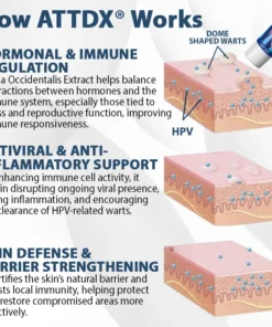 Hormonal imbalances involving estrogen, progesterone, and cortisol can disrupt immune system regulation, weakening the body’s natural defense against infections. This dysregulation makes it more difficult to control or allowing the virus to persist. As a result, individuals may experience increased susceptibility to wart formation and a higher risk of recurrence. ATTDX® ManGuard HPV Wart Healing Cream supports the skin’s natural recovery process by helping reduce visible warts and associated irritation. Its consistent use can aid in managing flare-ups and provide localized care, especially when the body’s immune response is compromised.
