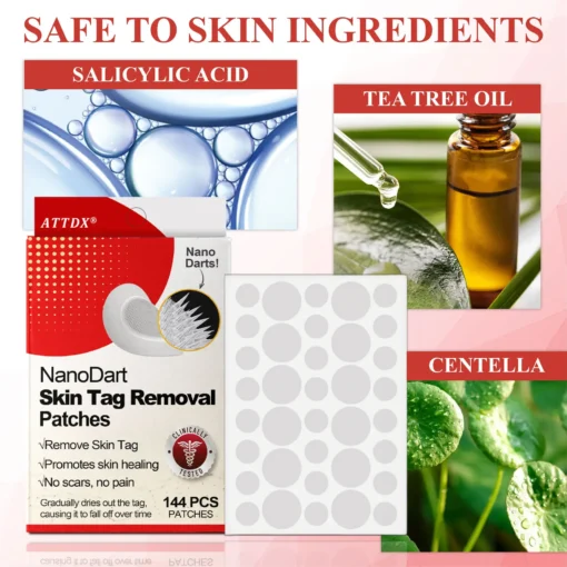 ATTDX® NanoDart Skin Tag Removal Patches combine Salicylic Acid, Tea Tree Oil, and Centella Asiatica for powerful skin treatment. Salicylic Acid exfoliates and penetrates deep to break down growths, while Tea Tree Oil offers natural antibacterial and anti-inflammatory properties to soothe the skin. Centella Asiatica promotes healing and regeneration, reducing irritation and supporting healthy skin recovery.