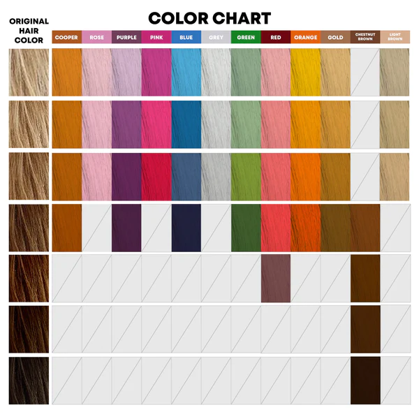 | COLOR | COOPER, ROSE, PURPLE, PINK, BLUE, GREY, GREEN, RED, ORANGE, GOLD, CHESTNUT BROWN, LIGHT BROWN |