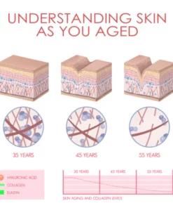 As we age, our skin’s natural production of Collagen, Hyaluronic Acid, and Ceramides declines. This leads to skin aging and the appearance of wrinkles, dryness, uneven skin tone, and loss of firmness.