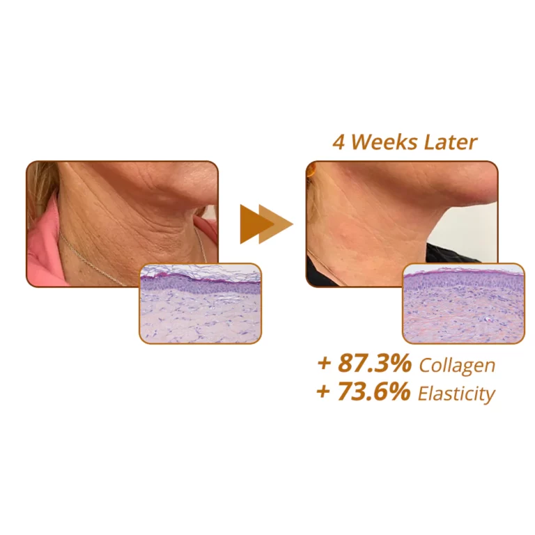 “After experiencing weight loss, I noticed sagging neck skin, wrinkles, and fine lines, causing frustration and self-consciousness. Seeking a solution, I chose RevitaPeptide Reversal Serum. Within a few weeks, my skin’s texture and appearance have greatly improved. The serum effectively smooths fine lines, boosts skin hydration, and adds a plumpness to my skin.” – Kae Jamison – 47 years old