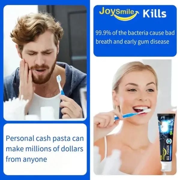 BBOJI™JoySmile Bee Toxin Treatment toothpaste eliminates 99.99% of bacteria, freshens breath, removes plaque and stones, treats gingivitis and periodontitis, relieves tooth pain, prevents and treats tooth decay, restores tooth enamel, stimulates dentin formation, and supports tooth renewal.