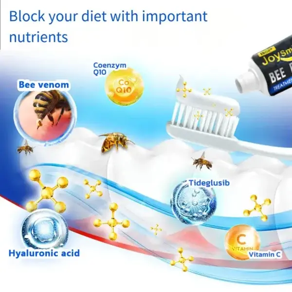Harness the power of BBOJI™JoySmile bee poison treatment toothpaste to deliver vital nutrients directly to your gums. This effective method ensures fast absorption and removes any obstacles between you and the preserved gums. After use, toothpaste produces immediate results by providing the essential elements needed for healthy gum tissue growth and recovery.