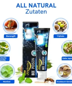 BBOJI™JoySmile Bee poison Treatment toothpaste takes full advantage of the natural properties of bee poison and other 100% natural herbs. These ingredients lead to healthier gum tissue and stronger tooth enamel.